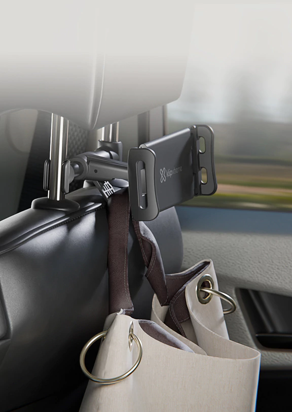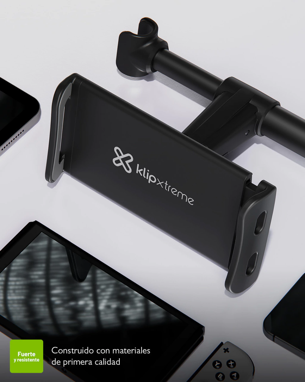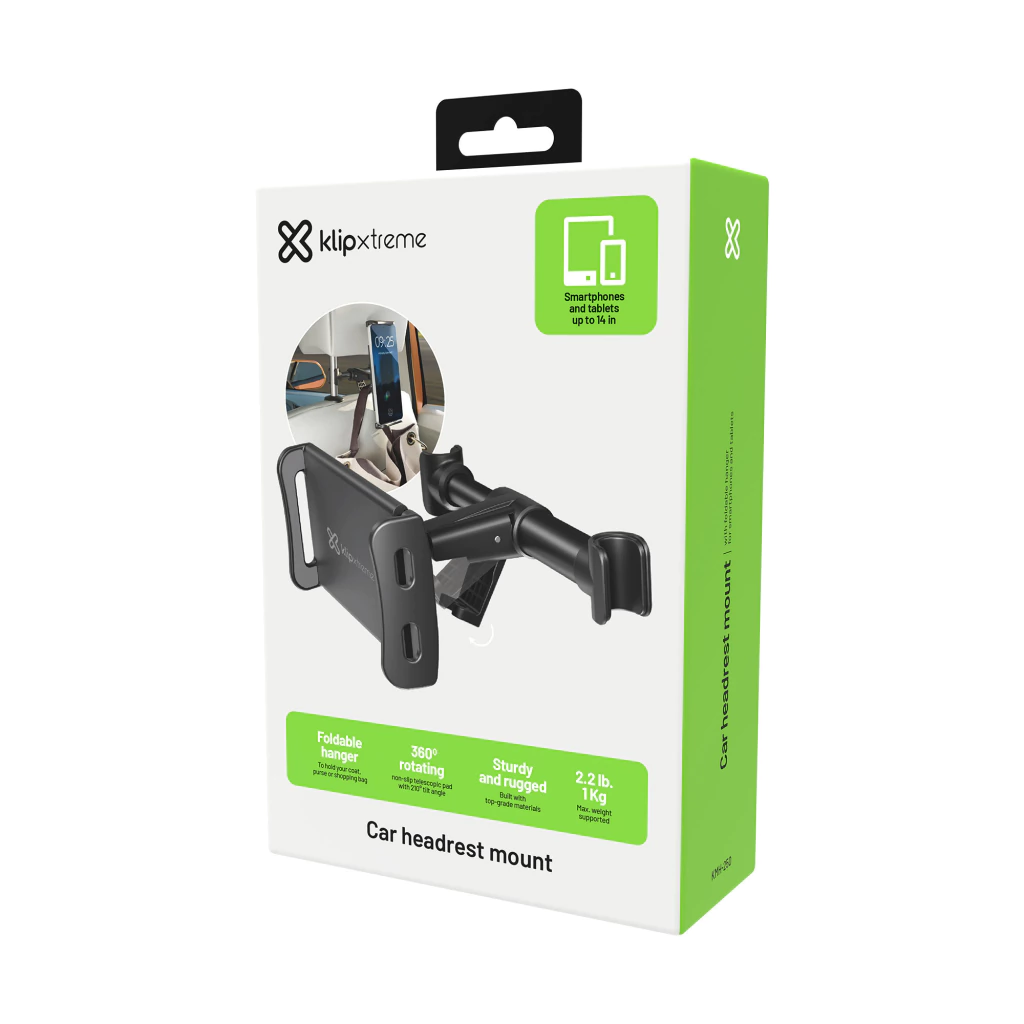 Disfruta de entretenimiento con manos libres viajando con este soporte para reposacabezas de automóvil con un gancho plegable, diseñado por KlipXtreme para dispositivos móviles. Disfruta de una rotación de 360° y una inclinación de 210°, para que puedas cambiar fácilmente entre vistas verticales y horizontales. Ideal para viajes por carretera o desplazamientos diarios, proporciona un ajuste seguro y ajustable para cualquier dispositivo.