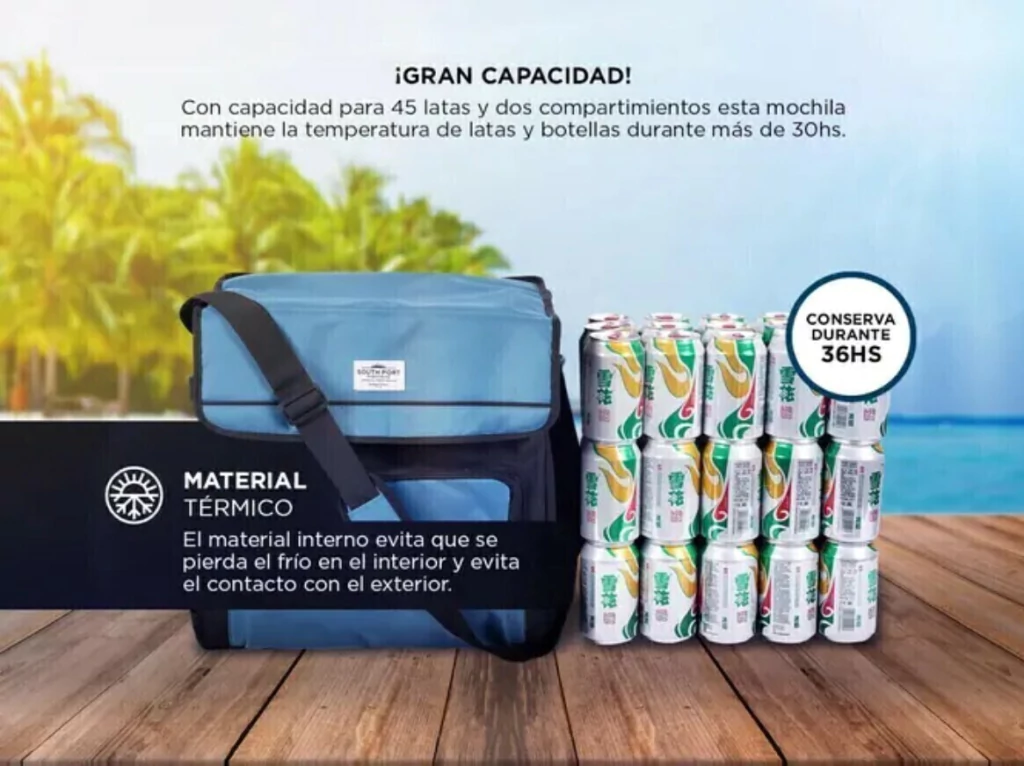 Con una gran capacidad para 45 latas y dos compartimientos este bolso mantiene la temperatura de latas y botellas durante más de 30hs.